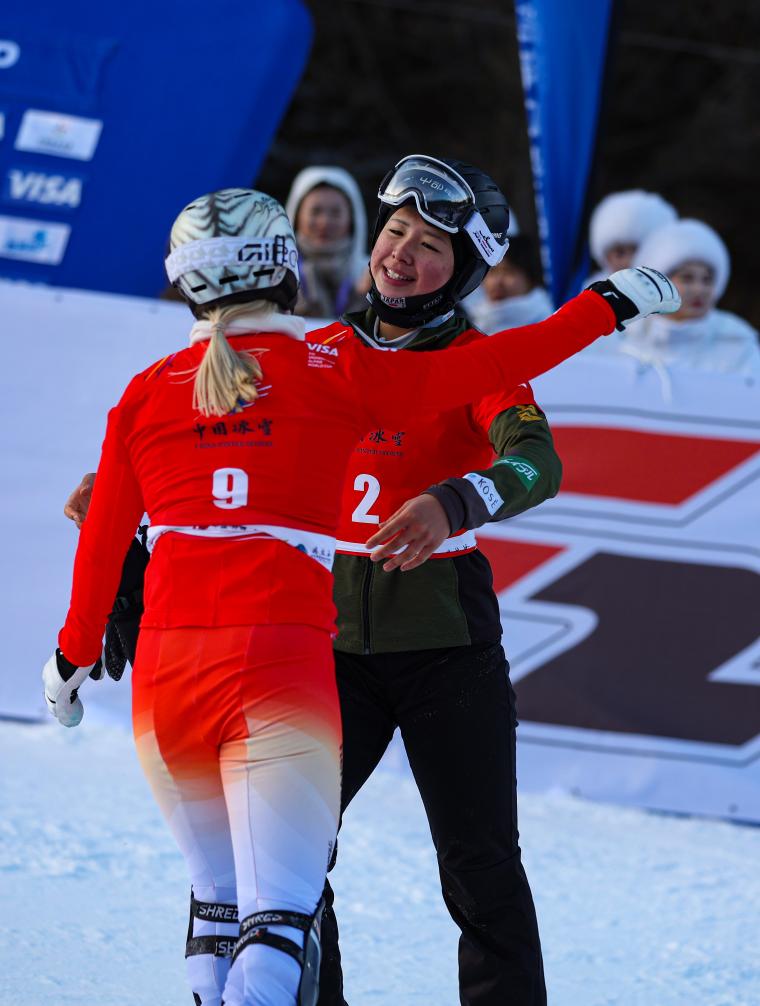 12月7日,冠军日本选手三木椿(右)与亚军瑞士选手朱莉·佐格相互祝贺。