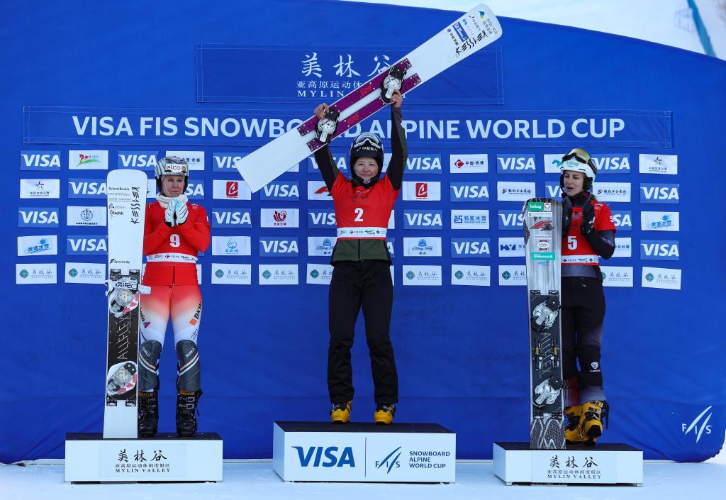 12月7日,女子组冠军日本选手三木椿(中)、亚军瑞士选手朱莉·佐格(左)、季军奥地利选手萨比娜·派尔在颁奖仪式上庆祝。